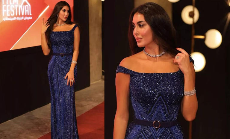 | فستان ياسمين صبري يحتوي 300 ألف حبة كريستال |
