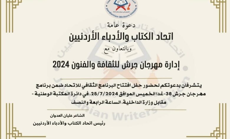 اتحاد الكتاب والأدباء، وبالتعاون مع إدارة مهرجان جرش للثقافة والفنون 2024، يتشرفان بدعوتكم لحضور حفل افتتاح البرنامج الثقافي للاتحاد ضمن فعاليات الدورة 38... |