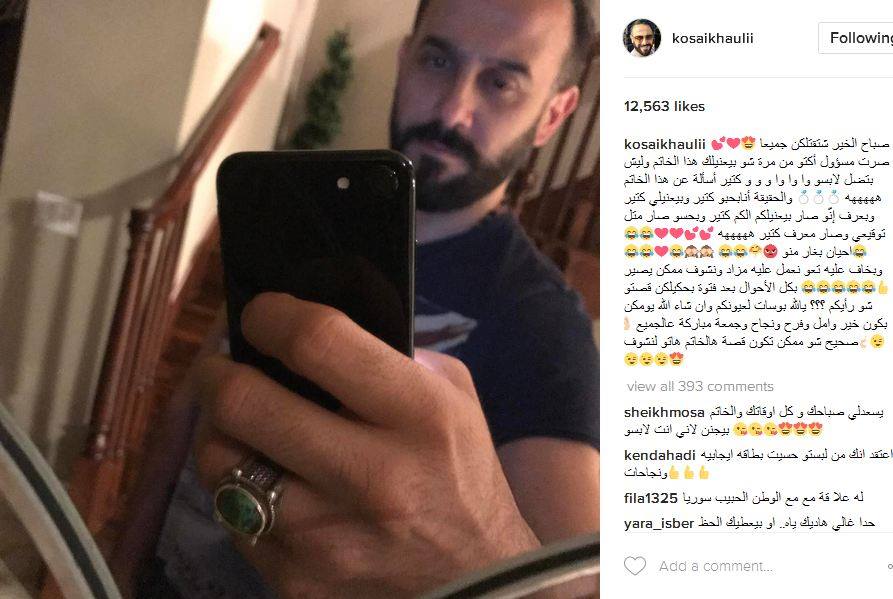 نشر الفنان قصي خولي عبر حسابه الشخصي على موقع “إنستقرام” صورة “سيلفي” له وهو يرتدي خاتم ويروي قصته لجمهوره. وعلق “خولي” على الصورة قائلا “صباح الخير شتقتلكن جميعا صرت مسؤول... |