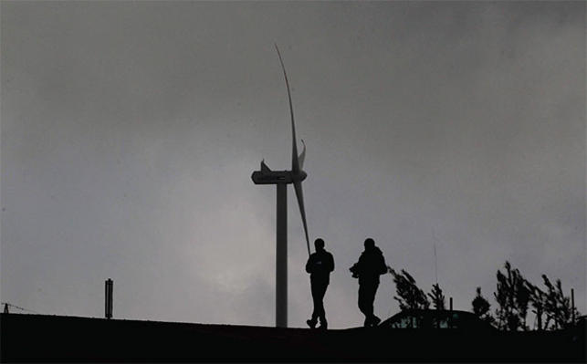 شابان يمران بالقرب من مراوح ضخمة لتوليد الكهرباء من طاقة الرياح في إحدى مناطق الطفيلة مؤخرا.ويتجه الأردن في الوقت الراهن إلى الاستفادة من طاقة الشمس والرياح في توليد... |