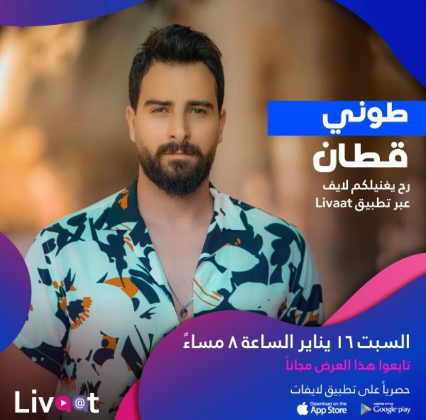 يحي النجم الشاب طوني قطان حفلاً فنياً مباشراً عبر تطبيق لايفات، والذي يبث حفلات مباشرة اونلاين لمجموعة من الفنانين، وذلك يوم السبت الموافق 16-1-2021 حيث سيبث الحفل بشكل... |