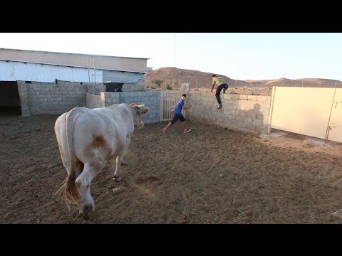 | اخطر تحدي | شباب يلمسو ثور ويهربون !! |